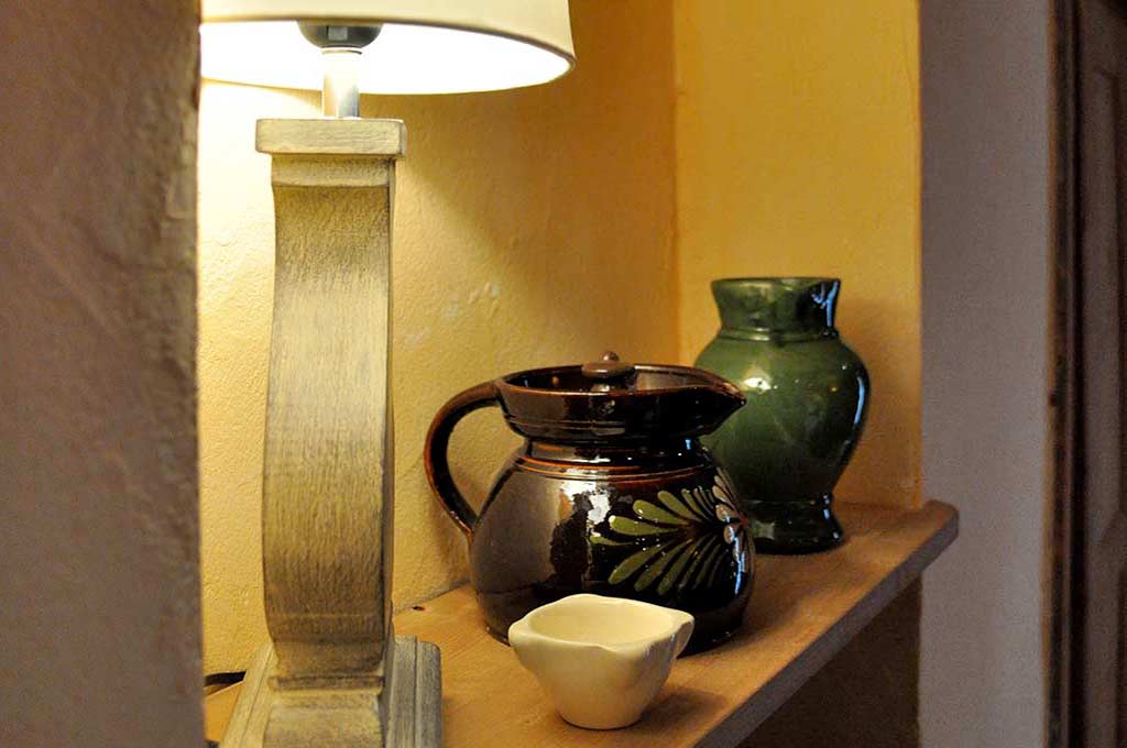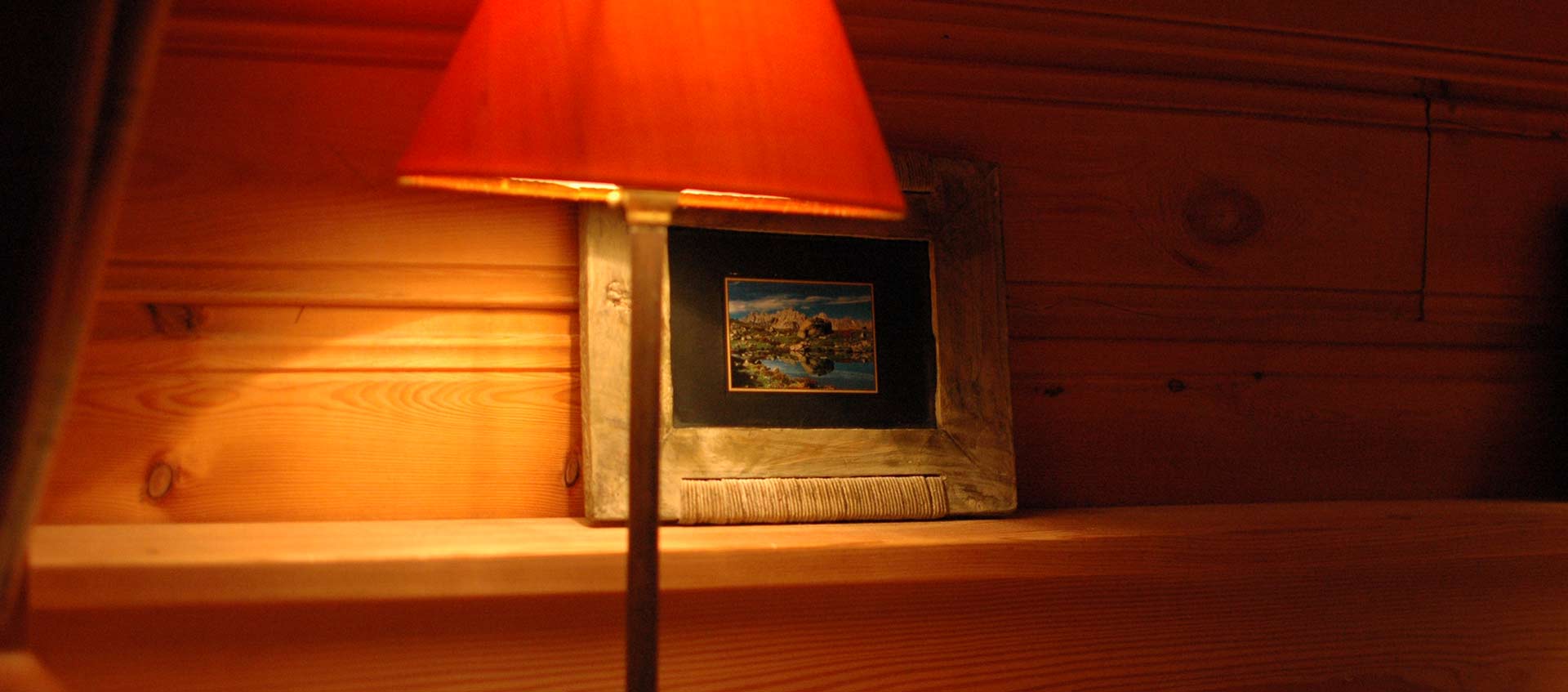 Cette pièce est tout en bois. De petits hallogènes sont insérés dans le plafond. On retrouve un mélange d’ancien et de moderne.